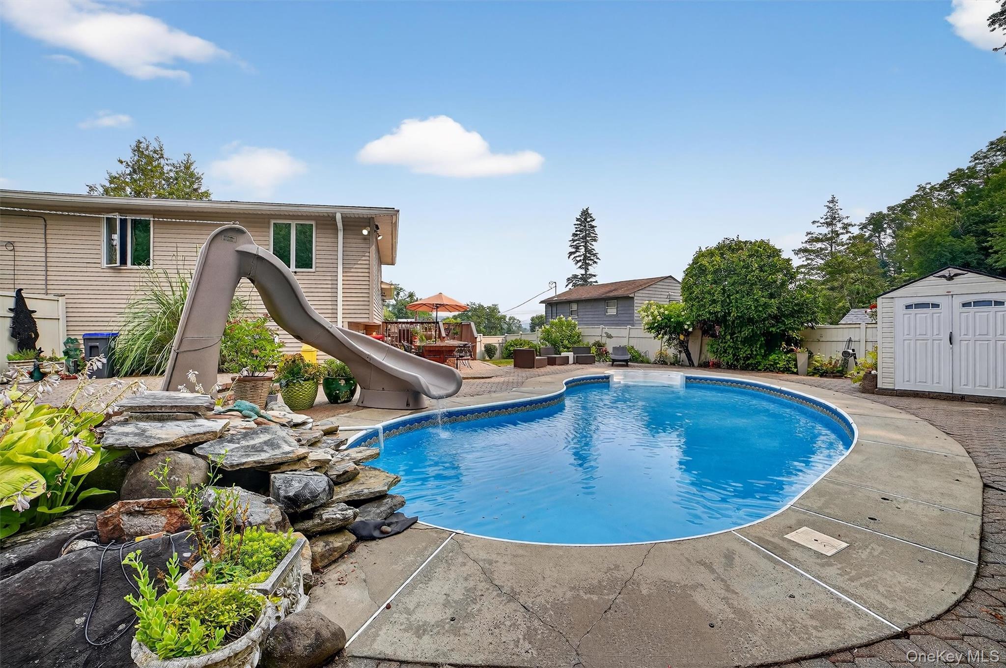 Welcome to this beautifully maintained, move-in ready 3-bedroom, 2-bathroom home in the sought-after Suburban Manor neighborhood of Elmsford! Step through the inviting entryway into a bright and airy Living Room filled with natural light. The spacious Eat-in Kitchen features granite countertops, oak cabinetry, skylight and stainless steel appliances - perfect for everyday living and entertaining. Adjacent is the Dining Area with sliding glass doors leading to a Trex Deck, a private backyard, and an in-ground pool - ideal for summer gatherings and relaxation. The Upper Level offers a Primary Bedroom, two additional well-sized Bedrooms, and a Full Bath. On the Lower Level, you'll find a cozy Family Room, a second Full Bath, and direct access to the 1-car garage. The basement includes a Media Room, Laundry Area, Storage, and Utility Room, offering ample space for all your needs. Conveniently located close to the Metro-North train station, major highways, and shopping centers. This home truly has it all!